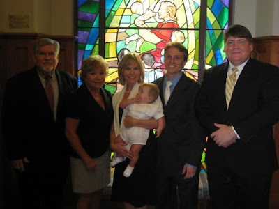 cept Davis usually "sings" himself to sleep- especially when Dad is holding him. I will usually have to head back to the cry room with him (soundproof room at back of the church where you can hear and see the service, but the babes can wail and no one hears them. We spend a lot of time in there). But luckily, Davis just nodded off to sleep, in silence. Before you know it, it was time to get baptised. Tim held Davis, still fast asleep (a SUPER rare occurrence that he would be so sounds asleep) as reverend Dan blessed him. He used the water that I got from the spring on our family farm in Sulphur Well, KY. Davis slept right through it. Then Dan asked if he would wake up upset if he held Davis up for the congregation to see. I nervously said he would be fine, knowing that Davis might very well let out a blood curdling scream. But I wanted everyone to see him, so Dan lifted him up and everyone clapped. Well that woke him up! but he didn't scream- he didn't even look that surprised, so I guess I owe him one. I guess he is used to waking up in weird places? He wakes up in the Baby Bjorn on the go all the time.