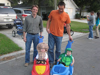 So after I pulled Davis away from the thrill of the doggie door, we headed over to Amanda and Grey's house for a playgroup Halloween party. It was great- Amanda's new house is gorgeous and the back room is baby proof. Davis and Grey are really starting to play together, even without Amanda and I parking them next to each other. Davis scurried right over to Grey's mock four wheeler and helped him tip it over. This may be a sign of things to come and I think those two are really going to get each other in trouble in a few years.